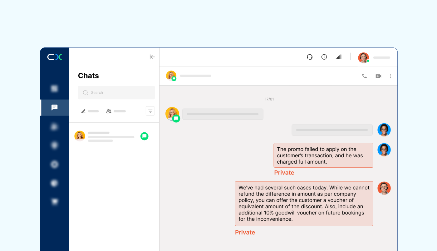 Sarah 意识到她需要经理的帮助来解决 Alex 的问题,因此她利用 CINNOX 的隐蔽协作功能,私下与经理进行咨询。