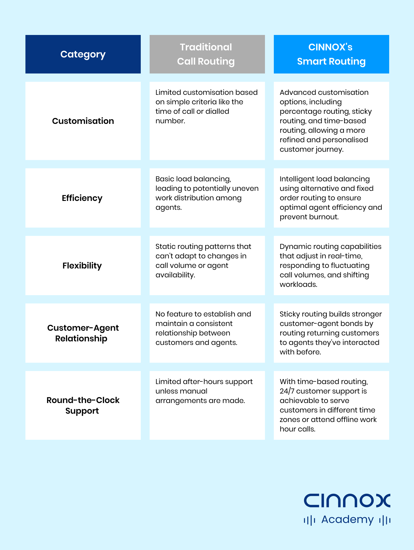 让我们退后一步,全面审视问题。我们将传统的呼叫路由方法与CINNOX的智能路由能力进行对比。这个比较展示了CINNOX带来的明显差异和优势。